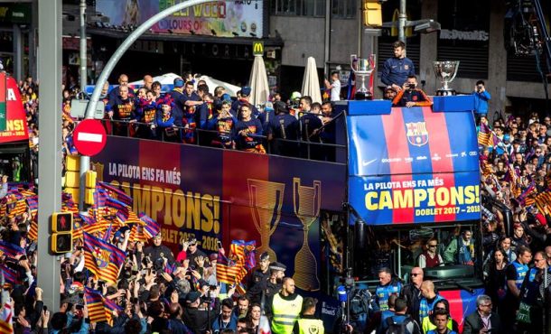 El Barcelona celebró ayer, lunes, 30 de abril de 2018, el octavo doblete de su historia con la ya tradicional rúa por las calles de la ciudad, en un festejo que congregó, durante dos horas, a decenas de miles de aficionados culés, entregados a un equipo que ha sabido reponerse de su doloroso e inesperado tropiezo en los cuartos de final de la liga de campeones, ganando Liga y Copa.