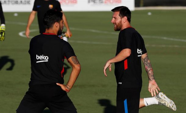 Lasvocesdelpueblo y Agencias – El equipo azulgrana descansa esta mañana antes de volver al trabajo el mañana jueves para preparar la ida de la Supercopa de España el próximo domingo, 13 de agosto en el Campo Nuevo, a las 22.00 horas, que disputará ante el mejor equipo de Europa: un Real Madrid que extendió su fiabilidad en finales europeas, guiado por una exhibición futbolística de Isco para tumbar a un luchador Manchester United en la final de la Supercopa de Europa (2-1), en la conquista del primer título en el inicio de un duro camino al soñado sextete. Barcelona (España), miércoles 9 de agosto de 2017. Fotografía: Los jugadores del FC Barcelona Leo Messi y Luis Suárez (i) durante un entrenamiento. Archivo Efe