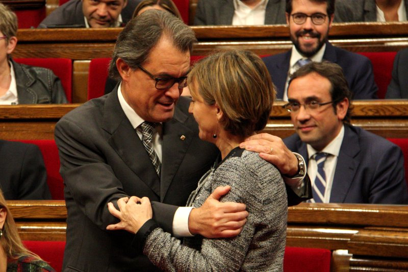 Lasvocesdelpueblo y Agencias – El Parlamento autonómico de Cataluña que preside Carme Forcadell Lluís ha hecho llegar este viernes en el Tribunal Constitucional (TC) de la Nación las alegaciones para oponerse a la impugnación del Gobierno de la patria a la resolución golpista del pasado lunes 9 de noviembre 2015 de las candidaturas separatistas catalanas al 27-S, Juntos Por El Sí (JxSí) y Candidatura de Unidad Popular (CUP). Fotografía: El presidente catalanista excluyente en funcions, Artur Mas (i), felicitando Carme Forcadell después de ser proclamada presidenta del Parlamento. Foto/ACN.