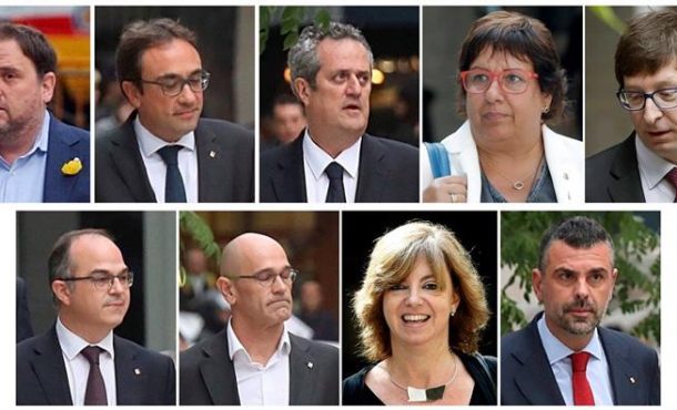 Lasvocesdelpueblo y Agencias – Destacan Oriol Junqueras (Arriba España, en el extrema izquierda); el ex «ministro de Asuntos Exteriores» de la Generalidad, Raúl Romeva (abajo el separatismo 2ª posición a la Izquierda) con los ojos cerrados, parece que la comida de la cárcel no le ha gustado mucho; y finalmente la encargada de comprar las Urnas del Referéndum del 1-O, Meritxell Borras (abajo el separatismo 3ª posición a la Izquierda), sonriente, parece disfrutar mucho de su primera noche en la cárcel. La juez ha enviado a prisión al exvicepresidente catalán Oriol Junqueras y a los ocho exconsellers que hoy han ido a declarar a la Audiencia Nacional, adonde no ha acudido el expresidente Carles Puigdemont, sobre quien pesa una petición de arresto internacional que aún no ha resuelto la magistrada. Madrid (España), jueves 2 de noviembre de 2017. Fotografía: CAPITAL DE ESPAÑA (MADRID), 2.11.2017. Combo de los sediciosos rebeldes exconsejeros para los que la juez de la Audiencia Nacional Carmen Lamela ha decretado prisión incondicional sin fianza: el exvicepresidente catalán Oriol Junqueras (arriba-i), el exconseller de Territorio Josep Rull (arriba-2i), el exconsejero de Interior Joaquim Forn (arriba-3i), la exconsejera de Trabajo Dolors Bassa (arriba-2d), el exconsejero de Justicia Carles Mundó (arriba-d), el exconseller de Presidencia Jordi Turull (abajo-i), el exconsejero de Asuntos Internacionales Raül Romeva (abajo-2i), la exconsejera de Gobernación Meritxell Borràs (abajo-2d) y el exconsejero de Empresa Santi Vila (abajo-d), al que se le ha impuesto una fianza de 50.000 euros para poder salir de la cárcel. Efe.