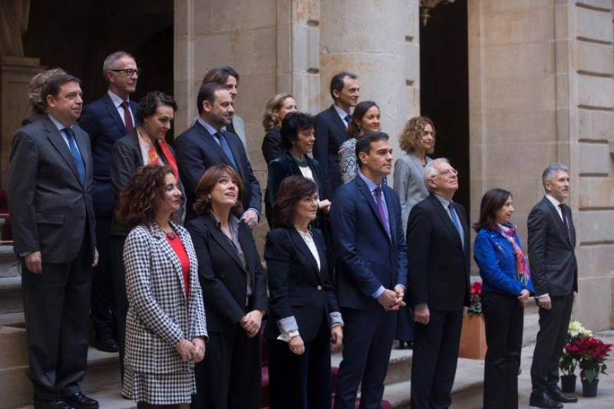 Posteriormente, los miembros del gabinete han aguardado colocados en la escalinata principal de la Llotja de Mar y Sánchez se ha situado en el centro de todos ellos para posar ante los informadores gráficos.
