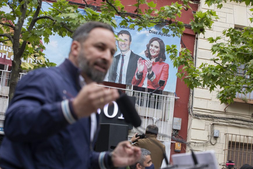 El presidente de VOX, Santiago Abascal Conde, y la candidata de esta formación política verde a la Presidencia de la Comunidad el próximo 4 de mayo de 2021 (4M), Rocío Monasterio San Martín, han criticado que el Tribunal Constitucional (TC) haya tardado tan sólo tres días en resolver un «asunto personal» —en referencia al recurso presentado por la candidatura del ex cargo de Ciutadans Partit de la Ciutadanía-Ciudadanos (Cs) Toni Cantó en las listas del PP a la Comunidad de Madrid, rechazada por el (TC) por su empadronamiento en la región madrileña fuera del plaza exigido por la Ley Electoral —, mientras que no ha resuelto los dos recursos presentados por VOX contra el Estado de Alarma. Madrid, 15 de abril de 2021.