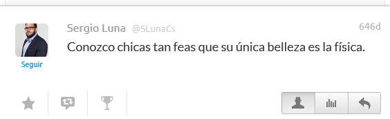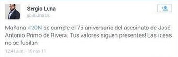 haber paz en España. José Antonio Primo de Rivera», firmó Luna que apuntó también en otro mensaje: «Mañana #20N se cumple el aniversario de José Antonio Primo de Rivera. Tus valores siguen presentes! Las ideas no se fusilan». «Conozco chicas tan feas que su única belleza es la física», dijo.