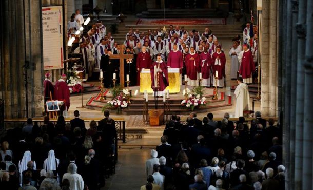 Agencias – Una semana después del atentado yihadista contra una iglesia de Normandía, la catedral de Ruán, en el norte de Francia, albergó hoy el funeral solemne del sacerdote muerto en ese ataque ejecutado por dos jóvenes que reivindicaron pertenecer al grupo terrorista yihadista Dáesh, también conocido como Estado Islámico (EI). París (Francia), martes 2 de agosto de 2016. Fotografía: El arzobispo de Ruán, Dominique Lebrun (c, al fondo), pronuncia unas palabras durante el funeral del sacerdote Jacques Hamel en la catedral de Ruán (Francia) hoy, 2 de agosto de 2016. Una semana después del atentado yihadista contra una iglesia de Normandía, la catedral de Ruán, en el norte de Francia, albergó hoy el funeral solemne del sacerdote muerto en ese ataque ejecutado por dos jóvenes que reivindicaron pertenecer al Estado Islámico (EI). Efe.