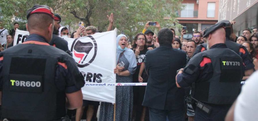 .El portavoz de «Los 11 de Vox» en el Parlamento de Cataluña, Joan Garriga Doménech; junto a sus compañeros por Barcelona a la cámara catalana, Mónica Lora Cisquer y Manuel Jesús Acosta Elías (Manuel Acosta) y el coordinador de VOX en Mataró, José Casado Ortega han plantada cara medio centenar de grupos de la extrema izquierda y grupos separatistas, entre ellos varios inmigrantes magrebíes, quienes recibido a los simpatizantes y militantes de la formación verde con gesto obscenos e insultos