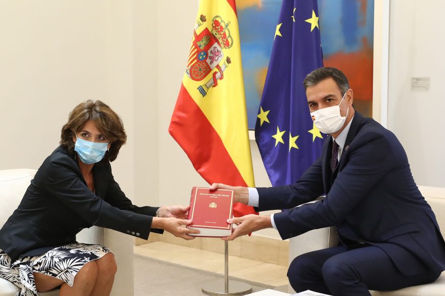 Madrid (España), viernes 3 de septiembre de 2021 (Lasvocesdelpueblo y Agencias).- La fiscal general del Estado, exministra de Justicia dle Gobierno de Pedro Sánchez Pérez Castejón (desde el 7 de junio de 2018 hasta 13 de enero de 2020), miembro del Partido Socialista Obrero Español (PSOE) y nombrada fiscal General por Sánchez, Dolores Delgado García, ha entregado este viernes al presidente del Gobierno, Pedro Sánchez Pedro Sánchez Pérez Castejón, la Memoria Anual de la Fiscalía.