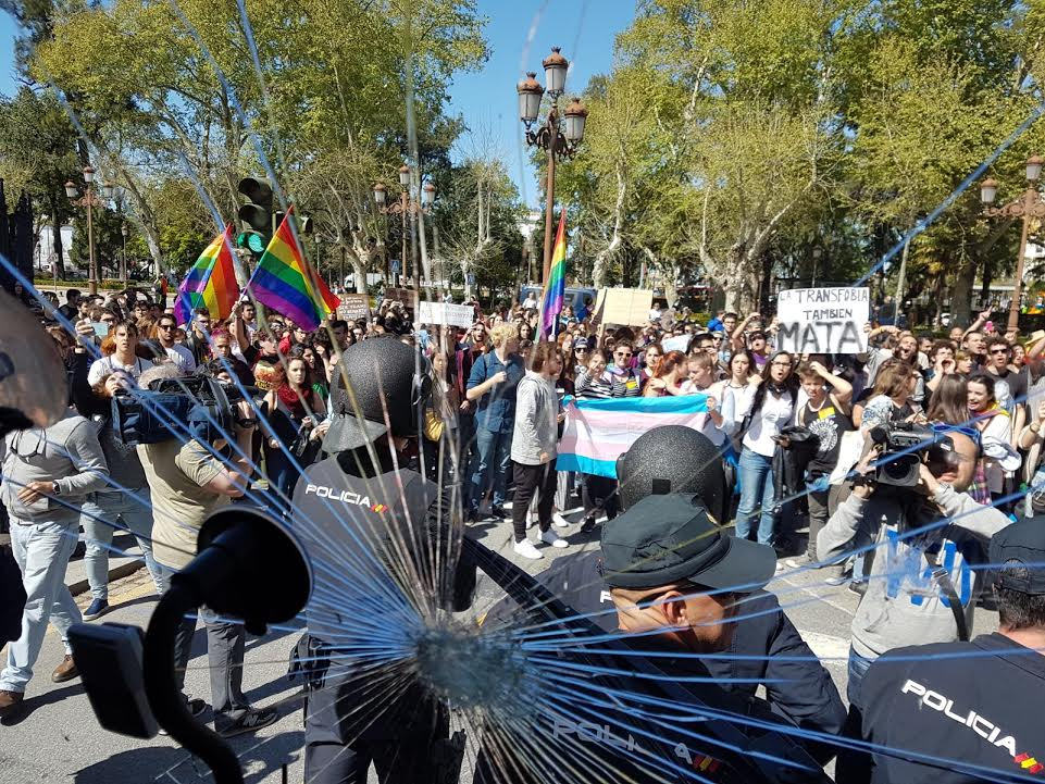 Las fotografías refleja la llegada de El bus De La Libertad a Sevilla se puede ver la brutalidad del ataque extremista de LGTB.
