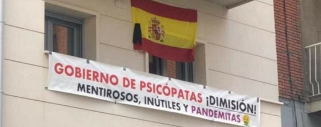 «Gobierno de psicópatas ¡dimisión! Mentirosos, inútiles y pandemitas», con una pandera Nacional con crepón negro de señal de luto por las víctimas mortales del COVID 19. Este compatriota español ha estas manifestaciones un mes de abril trágico por España, respecto a los caídos y contagios por COVID 19 en el país.