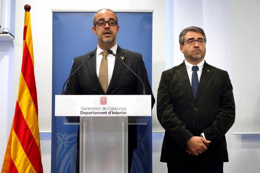 Redacción – Quim Torra se ha convertido hoy en el primer presidente de la Generalidad de Cataluña (Govern) que, junto a su Ejecutivo, viaja fuera de las fronteras de España sin escoltas de los Mozos de Escuadra, en paisano, después de la prohibición del Ministerio de Interior del Ejecutivo del presidente de Gobierno Pedro Sánchez, porque el presidente independentista Quim Torra iba a Bruselas (Bélgica) a hacer una conferencia contra España junto al huido delincuente expresidente de la Generalidad, Carles Puigdemont, a favor de un «referéndum de autodeterminación» en Cataluña. El acto previsto este lunes en la cámara europea ha sido cancelado después de confirmarse también la prohibición del Parlamento Europeo. Finalmente, el evento organizado por los secesionistas europeos —principalmente los de Flandes (Bélgica)— en solidaridad de sus aliados independentistas en Cataluña, tendrá lugar este mismo lunes en hotel de la capital belga. El jefe político de los Mozos (consejero de interior catalán), Miquel Busch, quien tacha de «extrema derecha» al partido del Pueblo Español (VOX), aunque no ha citado expresamente a VOX, cree que la presión de VOX sobre el Gobierno de Sánchez ha sido clave para prohibir que los Mozos de Escuadra vayan fuera de España para proteger al presidente y Ejecutivo de la Generalidad. «A nadie se les escapa que hay un auge de la extrema derecha en España y que puede haber alguna persona que se exceda, se extralimite en su protesta y quiera acudir al apartado físico», ha advertido Buch. Barcelona (España), lunes 18 de febrero de 2019. FOTOGRAFÍA: BARCELONA (ESPAÑA), 18.02.2019. El conseller de Interior, Miquel Buch (i) acompañado del director de los Mossos, Andreu Martínez (d), durante la rueda de prensa en la que ha denunciado este lunes, el «cambio de criterio» del Ministerio de Interior, al asegurar que por primera vez ha denegado el permiso para salir de España a los mossos que escoltan al presidente catalán, Quim Torra, y ha pedido al Gobierno que lo vuelva a autorizar, como hasta ahora. Efe.