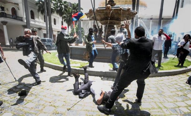 Efe – Un grupo de simpatizantes del Gobierno venezolano irrumpió hoy por la fuerza en la Asamblea Nacional (AN, Parlamento), de mayoría opositora, y causaron heridas a algunos diputados que se encontraban en el recinto para una sesión en conmemoración del Día de la Independencia de ese país. Caracas (Venezuela), miércoles 5 de julio de 2017. Fotografía: El diputado Armando Armas (c) es golpeado por manifestantes del chavismo en el piso en la Asamblea Nacional hoy, miércoles 5 de julio de 2017, en Caracas (Venezuela). Efe.