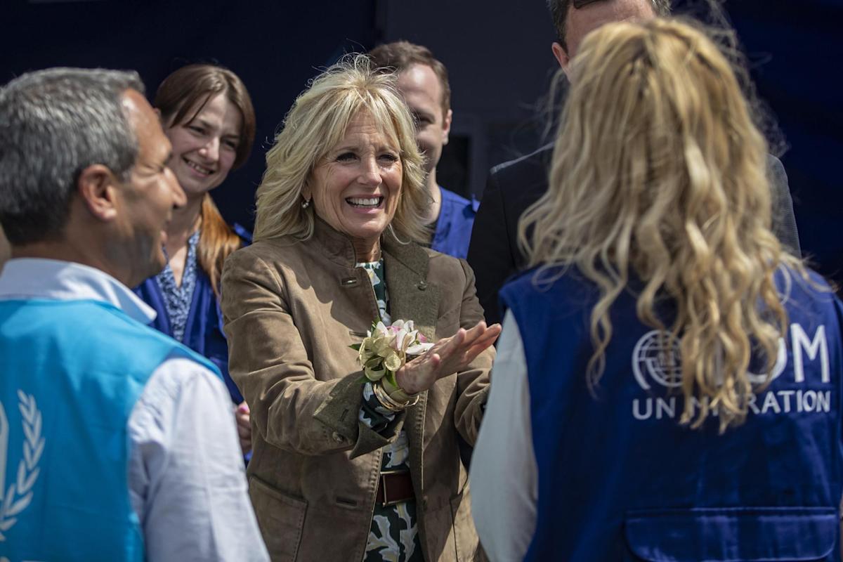Antes de cruzar la frontera, Jill Biden se reunió con familias de refugiados en un centro de ayuda de emergencia en Kosice, en el este de Eslovaquia.