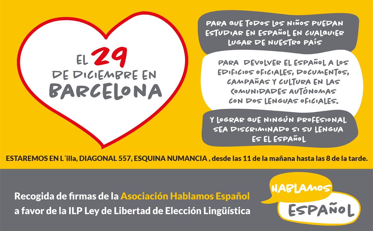 La recientemente constituida «Asociación Hablamos Español», que reúne a personas de diferentes entidades favorables a la libertad de elección de lengua, celebrará en Barcelona su segunda jornada de recogida de firmas.