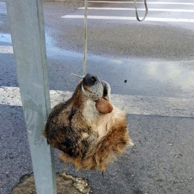 Efe – La asociación ha acusado a la administración de «mirar para otro lado» y de jugar a «dos bandas», al pretender «contentar a todas las partes sin aportar, de manera y forma definitiva, una verdadera solución adoptando las medidas necesarias, tanto desde el punto de vista científico como en la persecución de oficio de estos hechos tan lamentables». Oviedo, 30 mayo 2016. Fotografía facilitada por la Asociación de Vigilantes de Seguridad Privada de Asturias (Avispa) de la cabeza decapitada de un lobo que ha sido hallada colgada de una señal de tráfico en la localidad de La Doriga, concejo de Salas. Efe.