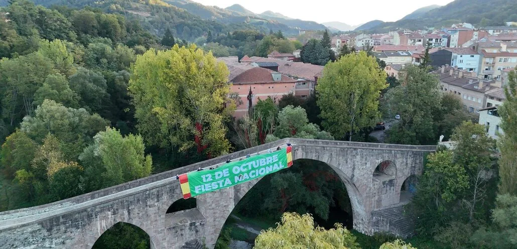 Sant Joan de les Abadesses (Gerona) Cataluña (Reino de España), domingo 12 octubre, de 2025 (Lasvocesdelpueblo).- HISPANIDAD 2025 | Sant Joan de les Abadesses, un municipio español en la Comarca del Ripollés, situado entre Camprodón y Ripoll, en la confluencia del río Ter y la riera de Arçamala, en el valle de San Juan, provincia de Gerona (Cataluña), ha amanecido este 12 de octubre con una gran pancarta colgada por los militantes de VOX, «en conmemoración del Día de la Hispanidad», aseguran fuentes provinciales de este partido político.