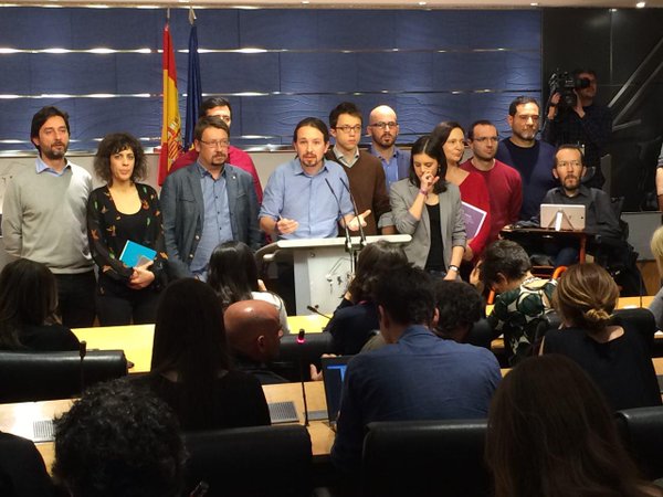 Lasvocesdelpueblo y rtve – Pablo Iglesias: «Celebraremos una consulta a las bases entre los días 14 y 16. Les preguntaremos a las bases si quieren un Gob. basado en el acuerdo Rivera-Sánchez». Y, como segunda pregunta: «Les preguntaremos también si quieren un Gobierno de cambio como el que queremos nosotros». Comparece un día después de la fallida reunión a tres con PSOE y C’s. Iglesias ofreció 20 propuestas, algunas «innegociables» para el PSOE. C’s lo estudiará por «cortesía» y no negociará más si Podemos no cambia. Madrid, 8 de abril 2016. Fotografía: Los dirigente de la formación extremista izquierdista hoy en rueda de prensa en el congreso de los diputados. Lasvocesdelpueblo.