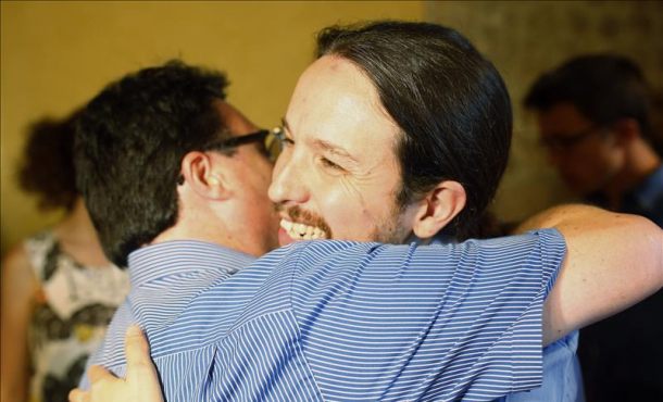 EFE – El coordinador de IU-EUiA y número 6 en la lista Cataluña Si Que Se Puede, Joan Josep Nuet, ha advertido a Podemos, en una conversación con Efe, de que renunciar a la unidad de la izquierda alternativa en una lista conjunta para las generales es «renunciar a ganar». Porque el partido de Pablo Iglesias, por sí solo, ha explicado, no podrá ser llave de nada, ni siquiera con un eventual pacto con los socialistas, como ha dejado caer el «número dos» del partido, Íñigo Errejón, porque -según Nuet- «no aguantarían en minoría con ellos». <Fotografía: El secretario general de Podemos, Pablo Iglesias (d), abraza al coordinador general de EUiA, Joan Josep Nuet, durante el acto en el que se ha presentado en Barcelona el acuerdo de Podemos Cataluña con ICV y EUiA para las elecciones generales. Foto/Archivo/Efe>.