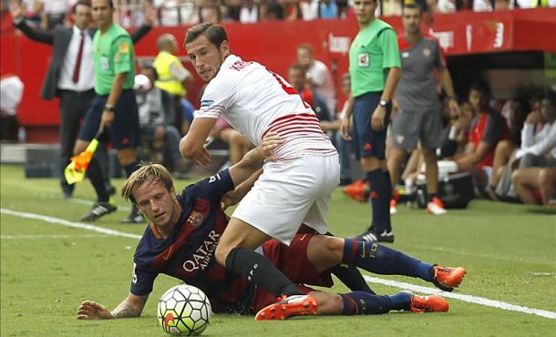 EFE – Ivan Rakitic, centrocampista croata del Barcelona, instó a su equipo a levantarse con rapidez, tras mostrar la rabia de perder de la forma que lo hicieron en el Sánchez Pizjuán (2-1), con tres remates a los postes, y aseguró que «duele siempre perder, más como hoy». Barcelona, 3 de octubre 2015. <Fotografía: El centrocampista polaco del Sevilla Grzegorz Krychowiak (d) disputa un balón con el centrocampista croata del FC Barcelona Ivan Rakitic (i), durante el partido frente al Sevilla de la séptima jornada de la Liga de Primera División que se jugó en el estadio Ramón Sánchez-Pizjuán. Foto/Efe>.