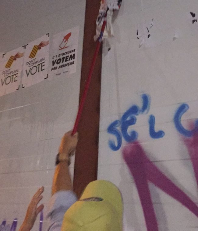 Redacción – La juventud catalana da la cara por España en las calles de Cataluña arrancando los carteles de la campaña del referéndum ilegal, que ensucia las calles de sus ciudades en Cataluña, convocado por el Gobierno de la Generalidad de Cataluña y suspendido por la Justicia. Barcelona (España), lunes 25 de septiembre de 2017. Fotografía: CATALUÑA (ESPAÑA), 24.09.2017. En la Imagen, dos jóvenes carteles limpiando sus calles arrancado carteles del referéndum ilegal del 1-O. Lasvocesdelpueblo.