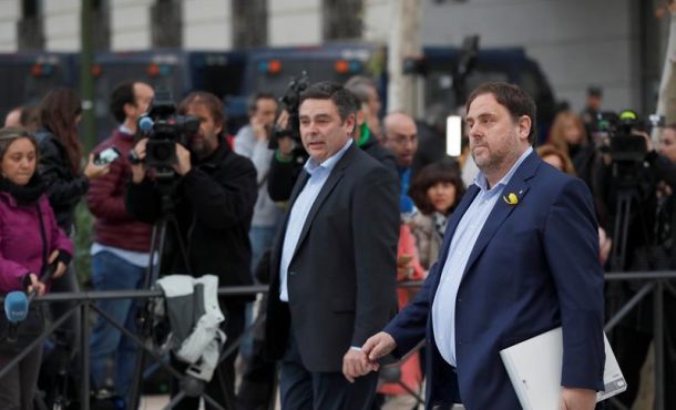 Lasvocesdelpueblo y Agencias – El golpista ex vicepresidente del Gobierno de la Generalidad de Cataluña de Cataluña Oriol Junqueras ha sido el primero en llegar a la Audiencia Nacional donde está citado, como el resto del Govern, para declarar a partir de las 9:00 horas por delitos de rebelión, sedición y malversación. Madrid (España), jueves 2 de noviembre de 2017. Fotografía: MADRID (ESPAÑA), 2.11.2017. EL vicepresidente cesado de la Generalidad de Cataluña, Oriol Junqueras, a su llegada a la sede de la Audiencia Nacional donde los hoy están citados a declarar el expresidente de la Generalitat y el resto de ex miembros del Gobierno catalán como imputados por delitos de rebelión, sedición y malversación tras la declaración unilateral de independencia, anulada por el Tribunal Constitucional. Efe.