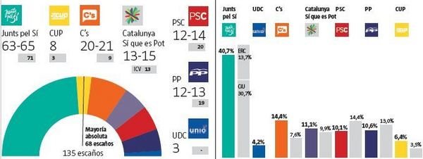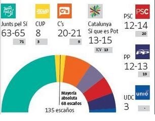 Juntos Por El Sí del derechista Artur Mas Gavarró y los ultras de la batasuna catalana, antieuropeos, anticapitalistas y anti-OTAN conocidos como Candidatura de Unidad Popular (CUP) que lidera David Fernández tendrían una horquilla total de hasta 73 diputados.