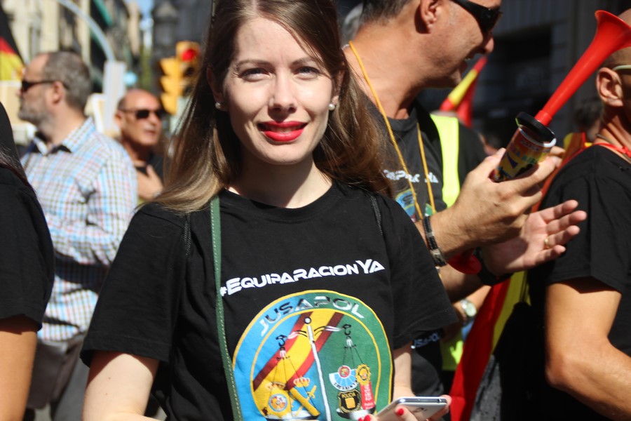 Redacción – «El mozo de Escuadra que menos cobra anualmente lo hace por 34.000 euros brutos, 10.000 euros anuales más que un Policía Nacional o un Guardia Civil». Además, aseguran fuentes de la asociación de las Fuerzas y Cuerpos de Seguridad del Estado que: «No se igualan los salarios mensuales y tampoco los garantiza debido a que se está aplicando los cálculos por el promedio del coste anual a la administración y no por los complementos específicos de las nóminas», han dicho hoy fuentes de la asociación policial en una nota a Ñ Pueblo Lasvocesdelpueblo. Barcelona (España), miércoles 17 de octubre de 2018. fotografía: VÍA LAYETANA DE BARCELONA (BARCELONA) ESPAÑA, 29.09.2018. Un joven española, vecina de Cataluña, arropa a las Fuerzas y Cuerpos de Seguridad del Estado en barcelona. Hoy El orgullo de más de 100 personas por pertenecer a una gran Nación, España, ha inundado la Vía Layetana de Barcelona, pese a la amenaza del independentismo con romper el acto y agredir a las niñas, niños, mujeres de las FCSE y resto de los manifestantes.. Ñ Pueblo Lasvocesdelpueblo (184)