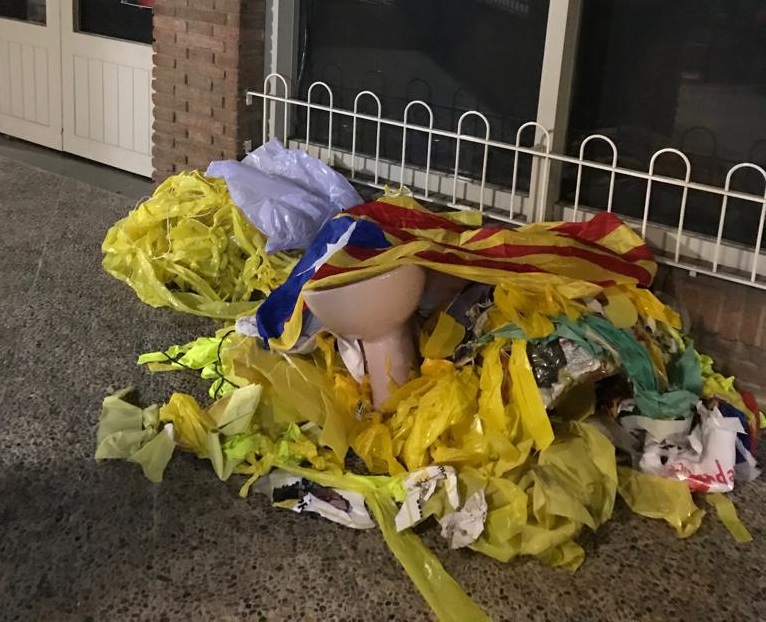 Redacción – Tres hijas y 4 hijos de España quitaron lazos amarillos, estrelladas y pancartas secesionistas en tres localidades españolas de la comarca barcelonesa del Maresme, Arenys de Munt, Orrius y San Andrés de Llavaneres, durante una acción heroica que iniciaba la noche del pasado viernes, 14 de diciembre de 2018, y finalizaba la madrugada del sábado 16 de diciembre en la localidad de San Andrés de Llavaneres, ante las puertas del antiespañol Joan Mora Buch quien es el actual alcalde xenófobo del partido racista del preso independnetista Oriol Junqueras Vies (ERC), donde entregaron a éste —aún atrapado en un sueño profundo— un váter para sus necesidades y toda la contaminante basura amarilla, que tanto le gusta a él y a su partido, de la operación. Llavaneras (España), domingo 16 de diciembre de 2018. Fotografía: ARRENYS DE MUNT, ORRIUS Y SAN ANDRÉS DE LLAVANERAS (BARCELONA) ESPAÑA, 14.12.2018. Vista de la basura independentista tras la acción de la gente española en Cataluña este viernes. Un grupo de 7 valientes hijas e hijos de España recuperan las ciudades españolas de Orrius, Arenys de Munt y San Andrés de Llavaneras durante una acción de la plataforma ‘Justicieros Nocturnos’. Lasvocesdelpueblo