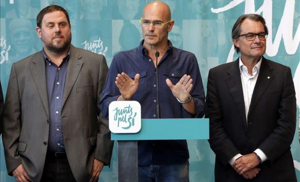 El líder de la candidatura, Raúl Romeva; el presidente catalán en funciones, Artur Mas (CDC); y el líder de ERC, Oriol Junqueras; han ofrecido hoy una conferencia de prensa en el Born Centre Cultural de Barcelona en la que han celebrado «la abrumadora victoria del sí» a la separación de Cataluña del resto de España.