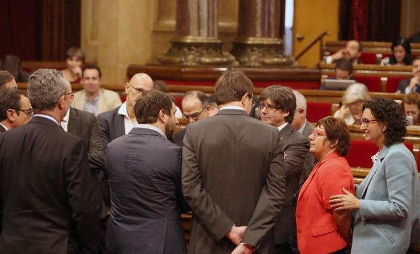 Agencias – Juntos Por el Sí (JxSí) y la CUP han forzado hoy la inclusión en el orden del día del pleno del Parlamento de Cataluña del debate y votación de la ley del referéndum y la exención de los trámites para su aprobación, en mitad de una gran bronca entre los portavoces de los grupos parlamentarios y la presidenta de la Cámara, Carme Forcadell. Barcelona (España), miércoles 6 de septiembre de 2017. Fotografía: 06.09.2017. El presidente de la Generalidad de Cataluña, Carles Puigdemont (3d), junto a diputados de JxSi durante un receso del pleno. Efe.