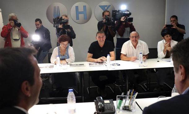 Agencias – Hoy mismo, la Delegación del Gobierno en Cantabria ha prohibido la concentración de homenaje y recibimiento al terrorista de la banda ETA, Rafa Díez Usabiaga, a su salida de la cárcel de El Dueso de Santoña (Cantabria) por incumplimiento del plazo que exige la ley para comunicar este tipo de actos. Guipuzcoa (España), miércoles 16 de agosto de 2017. Fotografía: MIERCOLES, 16.08.2017. Una delegación del partido proetarra EH Bildu encabeza por Arnaldo Otegi (c), Amaia Almirall (i), Juan Carlos Izagirre (2d), y Maddalen Iriarte (d), durante la reunión que mantuvieron hoy con representantes de la Asociación de Empresarios de Hostelería de Guipuzcoa. Efe