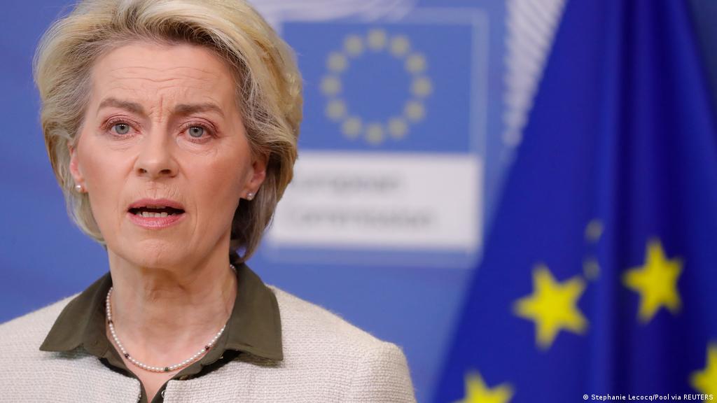 Efe.- Bruselas (Bélgica), domingo 27 de febrero de 2022. La presidente de la Comisión Europea, Ursula von der Leyen, propuso este domingo prohibir el aterrizaje, despegue o paso de cualquier avión ruso en el espacio aéreo de la Unión Europea y las emisiones de Russia Today y Sputnik en territorio comunitario, así como nuevas sanciones a Bielorrusia por su colaboración en la invasión de Ucrania.