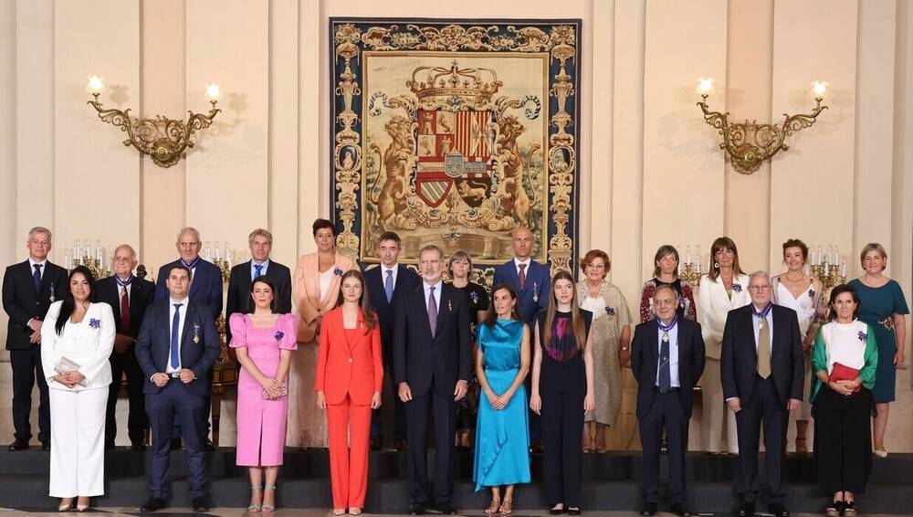 Sus Majestades el rey y la reina del Reino de España: don Juan Pablo Alfonso de Todos los Santos de Borbón y Grecia (Felipe VI) y doña Letizia Ortiz Rocasolano -respectivamente-, acompañados por Sus Altezas Reales: la Princesa de Asturias y la de Gerona y heredera al trono, doña Leonor de Borbón y Ortiz; y la Infanta, doña Sofía de Borbón y Ortiz; han presidido el acto de imposición de condecoraciones de la Orden del Mérito Civil, en el que han sido condecorados 19 personas (9 mujeres y 10 hombres), en reconocimiento de su «compromiso personal y contribución social», con ocasión del X Aniversario de la Proclamación de Su Majestad el rey Felipe VI (Juan Pablo Alfonso de Todos los Santos de Borbón y Grecia) como nuevo monarca y jefe del Estado español, hace 10 años.