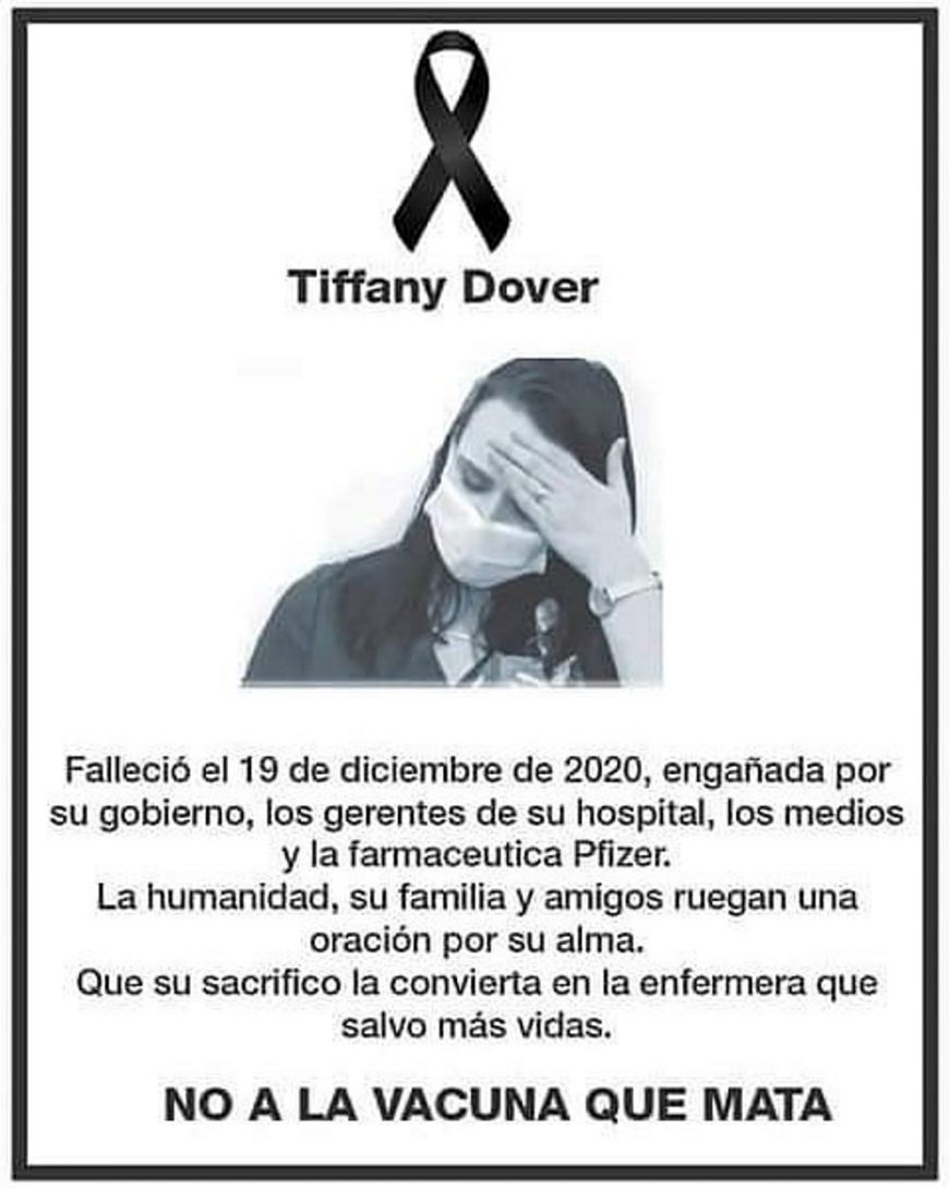 «La humanidad, su familia y amigos ruegan una oración por su alma. Que su sacrificio la convierta en la enfermera que salvó más vidas. No a la vacuna que mata». La misma esquela es compartida con diferentes presentaciones (1, 2, 3, 4, 5).
