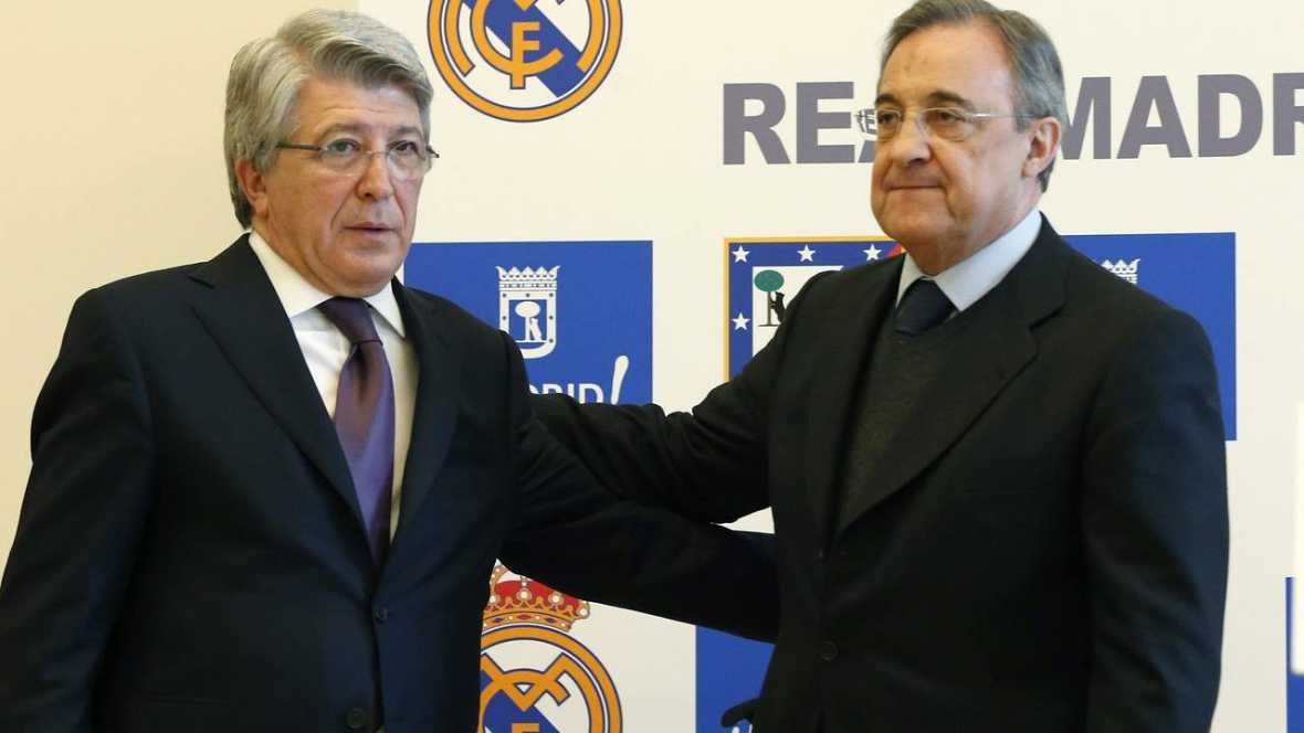 Efe – El Comité de Apelación de la FIFA ha concedido al Real Madrid y al Atlético de Madrid la suspensión cautelar de la sanción que les impuso el 14 de enero pasado por irregularidades en traspasos y altas de jugadores menores de edad. Los dos clubes madrileños fueron sancionados por dicho motivo y no podían fichar a ningún jugador en las dos próximos mercados de traspasos, el del próximo verano y el de invierno de enero del 2017. Madrid, 29 de enero 2016. Fotografía: Los presidentes del Real Madrid, Florentino Pérez (i), y del Atlético de Madrid, Enrique Cerezo (d) en un acto público. Efe.