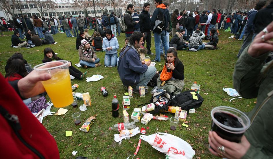 EFE – Las personas que consumen cerveza de forma moderada presentaron mejores hábitos alimentarios, una composición corporal más adecuada, mayores niveles de colesterol bueno y menores del malo que los no consumidores de esta bebida, según un estudio. Sevilla, 20 octubre 2015. <Fotografía: un grupo de jóvenes borrachos en un botellón>.