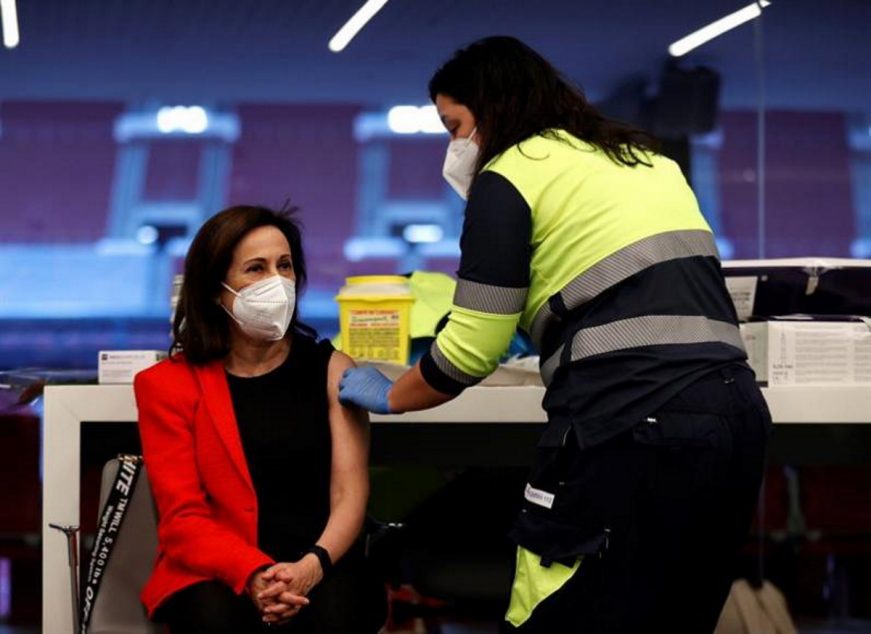 Efe – La ministra de Defensa, Margarita Robles, ha recibido este jueves la primera dosis de la vacuna de AstraZeneca en el madrileño estadio Wanda Metropolitano, tras lo que ha agradecido el trabajo de los sanitarios y ha deseado que el proceso de vacunación «vaya mejor» en vista del millón de dosis recibidas hoy. Madrid (España), viernes 2 de abril de 2021.