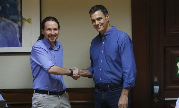 Lasvocesdelpueblo y Agencias – Manuel Escudero (PSOE): «Tenemos espacios políticos que no son iguales pero que en alguna medida se solapan en algunos aspectos y tenemos la necesidad de colaborar con el PSOE para que el cambio finalmente llegue, también en la política económica». Madrid (España), miércoles 23 de agosto de 2017. Fotografía: Los líderes de Podemos, Pablo Iglesias (i) y del PSOE, Pedro Sánchez, se saludan el pasado 17 de julio durante la reunión mantenida con sus equipos en el Congreso en el inicio de las negociaciones para buscar acuerdos parlamentarios. Archivo Efe.