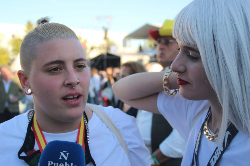 Entre los protagonistas, Paula y Estefanía, una joven pareja lesbiana (LGTBI) de VOX, muy «emocionada» por «estar aquí» entre los suyos y «escuchando a Abascal» (presidente de VOX, Santiago Abascal Conde). «Nos encanta VOX, teníamos mucha ganas de estar en un acto de ellos, y el mejor sitio es aquí», afirma la joven lesbiana Paula junto a su pareja Estefanía que, a su vez, explica que ella está «emocionada» por estar aquí y que «cada vez que escucho a Abascal, me quedo hipnotizada; no reacciono, de verdad» -explica la pareja de Paula- «(VOX) va a levantar el país y yo sé que lo va a hacer», añade Estefanía.