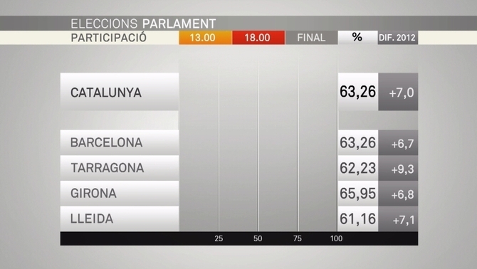 La participación en las elecciones autonómicas catalanas de este domingo 27 de septiembre 2015 es del 63,2% a las seis de la tarde, lo que supone un incremento de 6’9 puntos respecto a los comicios del año 2012. Son datos que acaba de confirmar la Consejera de Gobernación y Relaciones Institucionales del gobierno separatista de Artur Mas Gavarró, Meritxell Borràs.