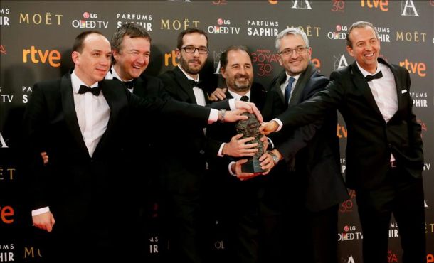 Efe – La película «Atrapa la bandera», del cineasta vallisoletano Enrique Gato, ha conseguido esta noche el Goya a la mejor película de animación. El equipo de productores han requerido al director Enrique Gato para que subiera a recoger el premio, aunque no dio tiempo a que el realizador agradeciera su premio, ya que se solapó el momento con el vídeo «in memoriam» que, todas las galas, recuerda a los hombres y mujeres del cine que han fallecido y que ha concluido con una aplaudida imagen de Lina Morgan. Madrid, 6 febrero 2016. Fotografía: Integrantes del equipo que ha creado la cinta de animación «Atrapa la bandera», tras recibir el Goya a la «Mejor película de animación», durante la ceremonia de la 30 edición de los Premios Goya, que entrega la Academia de Cine, celebrada esta noche en el Hotel Auditorium de Madrid. Efe.