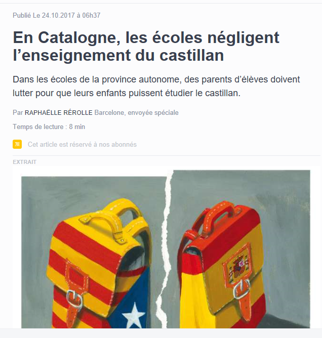 Redacción – Unos de los principales rotativos en Francia, «Le Monde» (El Mundo) denuncia la «prohibición» d ela lengua oficial del Estado español, el español (castellano) en una de sus «comunidades autónomas, Cataluña (Catalogne)», bajo titular, «En Cataluña, las escuelas pasan por alto (negligen) la enseñanza del castellano», titula el rotativo que lo subtitula así de claro: «En la comunidad autónoma española, los padres de los escolares deben luchar para sus hijos puedan estudiar en castellano» en Cataluña (España), denuncia la prensa francesa. París (Francia), miércoles 21 de febrero de 2018. Fotografía: CAPTURA DE LA DENUNCIA DE ROTATIVO ‘LE MONDE’. El rotativo francés denuncia la prohibición del castellano en Cataluña y el sufrimiento de los niños catalanes ante los engaños de los gobierno corruptos de Madrid cómplices por su pasividad y pactos secretos con el golpismo en Cataluña. Captura de la denuncia de ‘Le Monde’ sobre adoctrinamiento en Cataluña. Lasvocesdelpueblo.