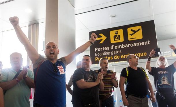 Agencias – Los trabajadores de los controles de seguridad del aeropuerto de ‘El Prado’ (Barcelona) Cataluña contratados por la empresa Eulen se han mostrado escépticos este sábado hacia el «Laudo de Obligado cumplimiento», del Gobierno del presidente Mariano Rajoy, dictado recientemente para poner fin al conflicto laboral que ha estallado este verano. Barcelona (España), sábado 2 de septiembre de 2017. Fotografía: CATALUÑA (ESPAÑA), EL PRAT DE LLOBREGAT (BARCELONA), 16.08.2017.- Trabajadores de Eulen protestan en la T2 del Aeropuerto de El Prado en el tercer día de huelga indefinida, horas antes de que esta tarde el Consejo de Ministros celebre una reunión extraordinaria para abordar el conflicto de El Prado, cuya solución pasa ahora por un arbitraje mediante un laudo obligatorio. Efe.
