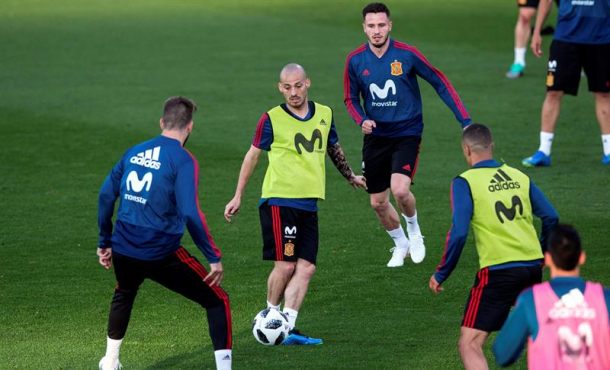 Después del calentamiento y un trabajo de posesión, el técnico diseñó un partido en tres cuartos de campo, con Álvaro Odriozola, Gerard Piqué, Jordi Alba, Sergio Busquets, Saúl Ñíguez, Andrés Iniesta, Iago Aspas y Diego Costa en un equipo; César Azpilicueta, Yeray Álvarez, Nacho Monreal, Koke Resurrección, Thiago Alcántara, Carlos Soler, Rodrigo Moreno y David Silva en otro; y Rodri Hernández, Jesús Vallejo, Iñaki Williams, Mikel Oyarzábal y Unai Núñez en un tercero en el que ejercían como ‘comodines’, aunque luego hizo cambios según fue avanzando el entrenamiento.