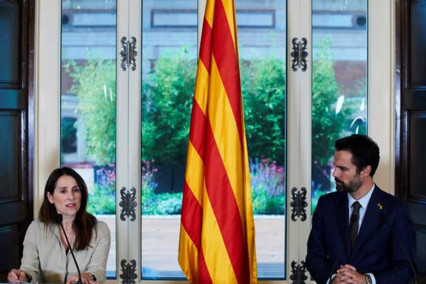 Lasvocesdelpueblo y Agencias – Y es que estos dos seres superiores secesionista —la presidente del Parlamento autonómico del País Vasco, Bakartxo Tejería, y el presidente del Parlament, Roger Torrent—, en una declaración institucional hoy en Cataluña, han sacado hoy del más allá el verbo «desjudicializar» para reafirmarse en un supuesto «dialogo» y poco después, se han desnudado, entre sus propias palabras: Tejería, que es miembro del PNV, ha asegurado seguir «muy de cerca» la actualidad política de Cataluña y ha aseverado que «la causa de la libertad catalana es la causa de la libertad vasca», esa mujer deja claro así que España es un Estado totalitario y tiene bajo represión a parte de ella que es Cataluña y, por eso, exige la «libertad» de Cataluña, «amiga del pueblo vasco«. Barcelona (España), lunes 16 de septiembre de 2019.