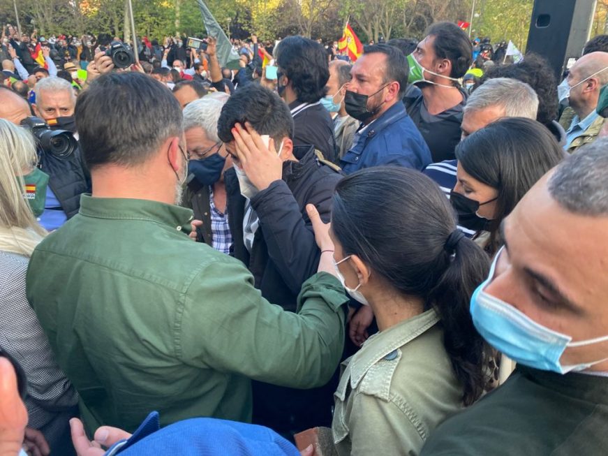 Entre los heridos, el diputado de VOX por Guadalajara, Ángel López, han confirmados fuentes madrileñas a Lasvocesdelpueblo. El diputado esta siwndo atendido en la Paz por una piedra en la mano, han dicho.