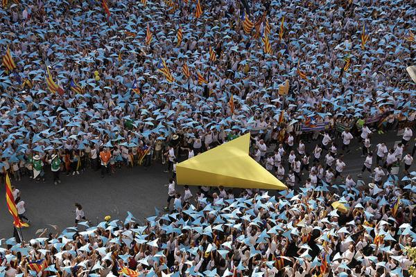 Agencias – La Vía de Libertad separatista en la hipotética República Catalana se ha completado a las 17: 59 horas de esta tarde cuando el puntero gigante ha llegado al escenario situado en la Avenida Meridiana con la calle Pujades, tras recorrer 5,2 kilómetros. La Avenida Meridiana de Barcelona se ha llenado hasta los trapos separatista y los participantes han formado un mosaico con los punteros de colores. <Fotografía: El puntero de la manifestación separatista catalana durante el recorrido de los 5,2 km de la Meridiana. Foto ANC>.