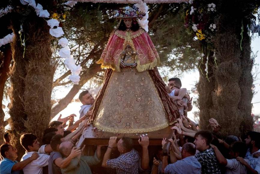 Efe – La Virgen del Rocío ha alcanzando Almonte (Huelva) pasadas las 6:00 horas, después de recorrer, a hombros de los almonteños y arropada por multitud de fieles, los 15 kilómetros que separan la aldea, donde está su Santuario, de su pueblo, donde permanecerá los próximos nueve meses. El Rocío (Huelva), miércoles 21 de agosto de 2019.