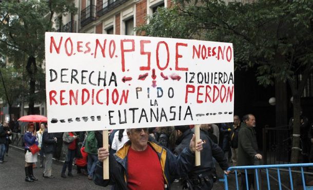 Agencias – Los concentrados vienen de agrupaciones socialistas de diferentes puntos de la península y exhiben pancartas con lemas como: «No es no». «Democracia en el PSOE», o «No a Rajoy, un militante, un voto». La mayoría llevan rosas, porque la convocatoria se ha llamado «la revolución de las rosas». Madrid (España), domingo 23 de octubre de 2016. Fotografía: Una persona porta una pancarta ante la sede del PSOE donde se va a celebrar la decisiva reunión de su Comité Federal en el que todo apunta a que va a consumar el giro del no a Mariano Rajoy a la abstención, lo que permitiría allanar la formación de gobierno después de diez meses de bloqueo. Efe.