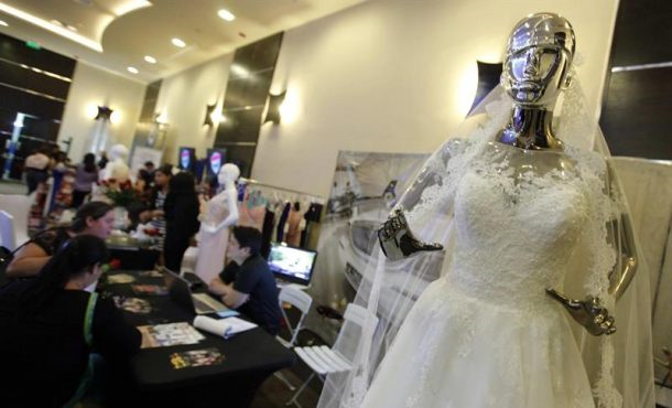 Efe – Según refleja la Estadística de Nulidades, Separaciones y Divorcios correspondiente a 2016 y difundida hoy por el Instituto Nacional de Estadística (INE), en 2016 un total de 101.294 parejas decidieron interrumpir su convivencia, una cifra similar a la del año anterior con un descenso de sólo el 0,1 % y una tasa de 2,2 rupturas por cada mil habitantes. Madrid (España9, lunes 25 de septiembre de 2017. Fotografía: Un grupo de personas visitan una feria de venta de trajes de novia. Archivo Efe.