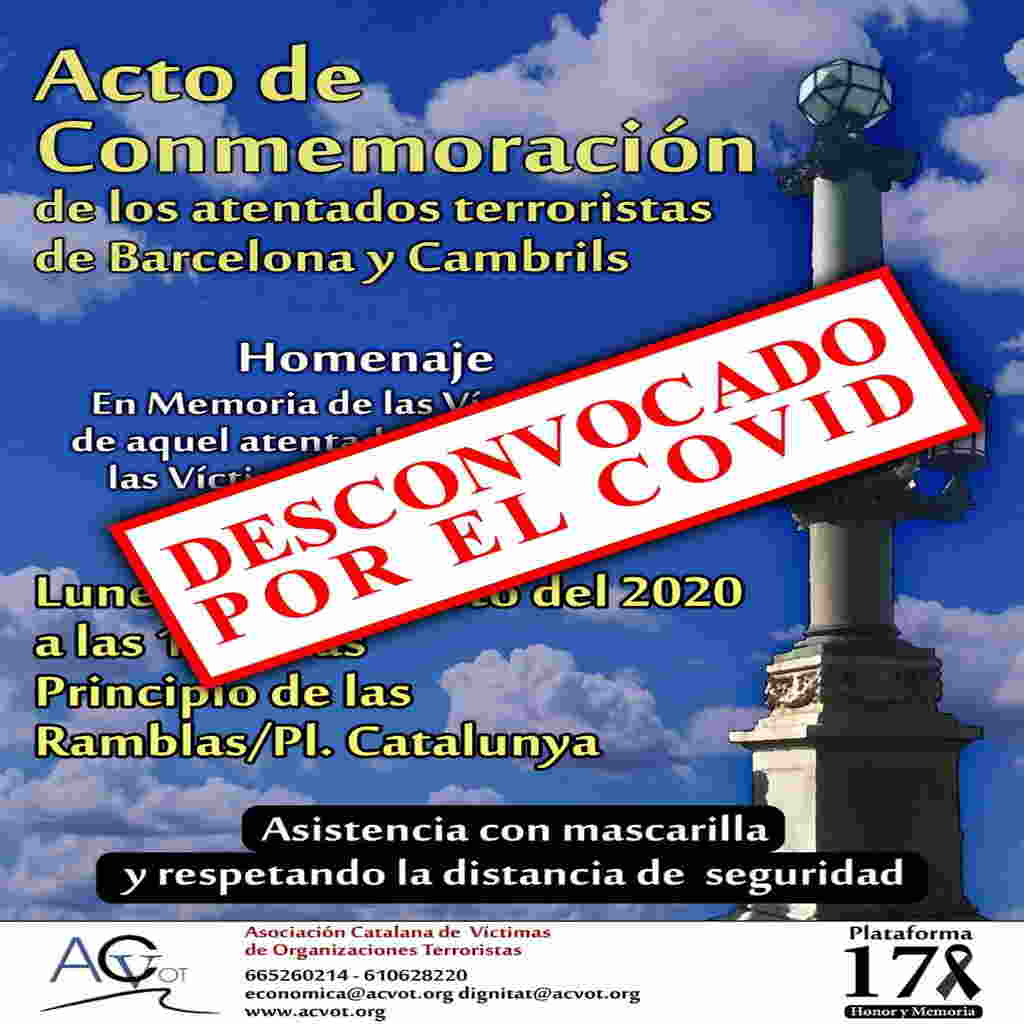 Redacción.- Barcelona (España), 11 de agosto de 2020. Comunicado. Barcelona, 11.08.2020. Hora: 8:54 horas. Asociación Catalana de Víctimas de Organizaciones Terroristas (ACVOT). Señores, Debido a las actuales condiciones por el covid 19 y por recomendaciones de las autoridades sanitarias y como se nos dice que en la concentración no puede haber más de 10 personas, lamentamos tener que suspender el acto previsto de recuerdo y memoria para las víctimas del terrorismo previsto para el día, lunes 17 de agosto de 2020.