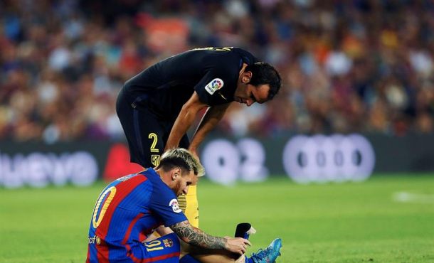 Agencias – El delantero de FC Barsa Leo Messi estará unas tres semanas de baja por una rotura en el aductor de la pierna derecha, según han informado los servicios médicos del club de la Ciudad Condal española en Cataluña, FC Barcelona. Barcelona (España), jueves 22 de septiembre de 2016. Fotografía: El defensa uruguayo del Atlético de Madrid, Diego Godín (arriba), se interesa por el delantero argentino del F. C. Barcelona, Leo Messi, tras caer lesionado durante el encuentro correspondiente a la quinta jornada de primera división, que han disputado en el estadio del Campo Nuevo, en Barcelona. Efe.